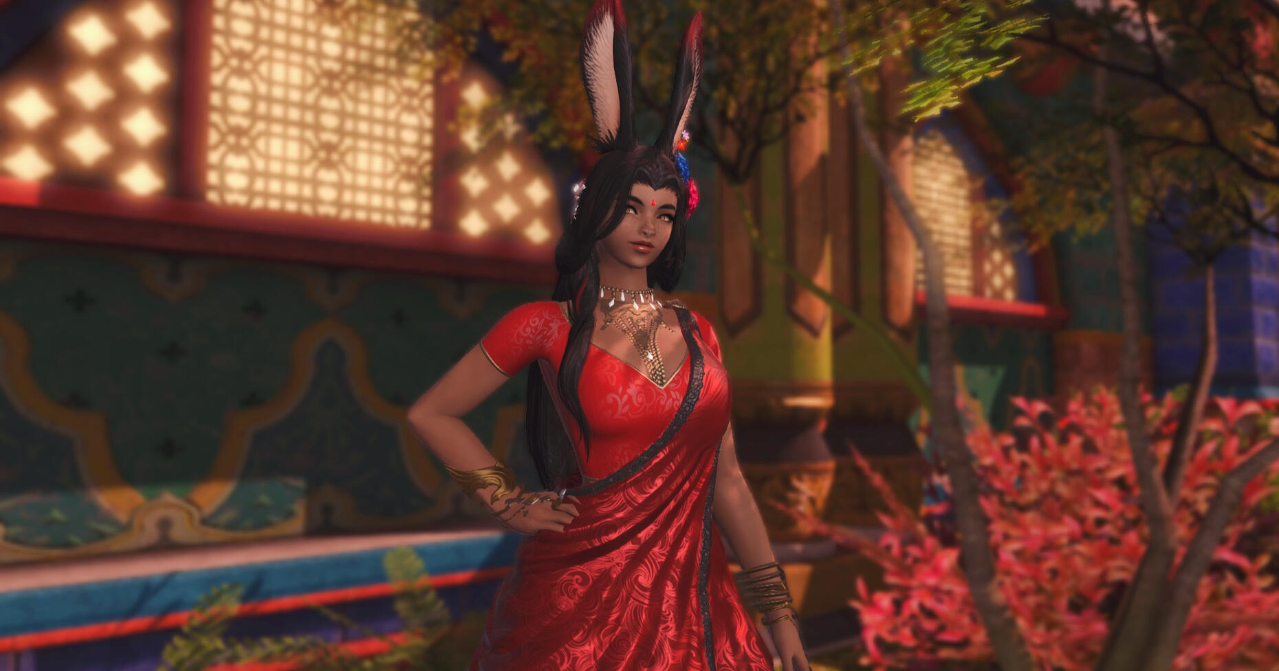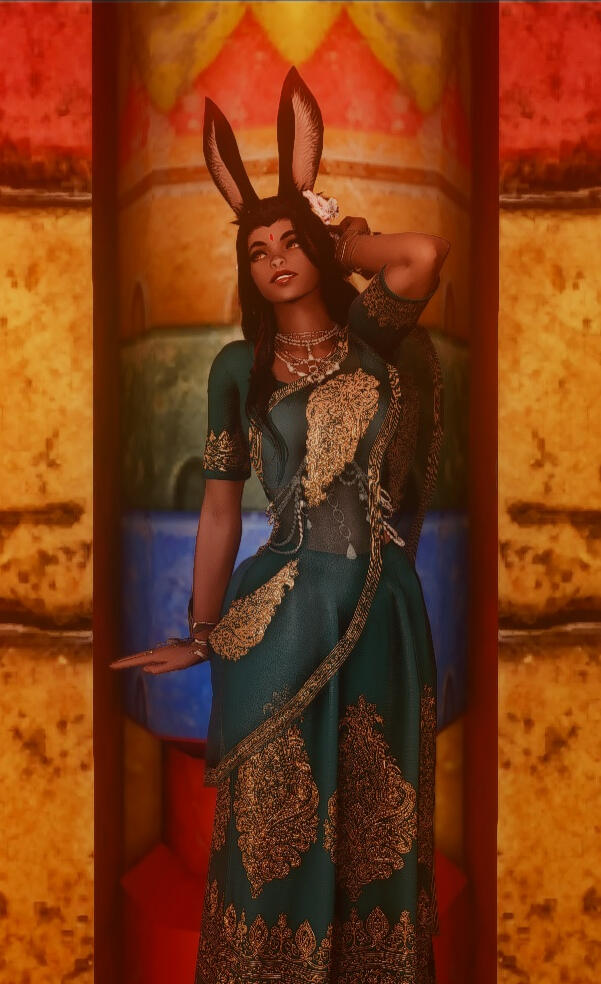 Sarahi has long black hair that falls in soft waves and is often loosely tied back with ornaments and flowers. She has natural red-tipped ears, and red streaks in her hair. Her eyes are honey yellow, and she has tattoos on her arms, legs, and belly.When she isn't hunting or warding the forest with her sisters in her village, she often wears colorful silk saris and embroidered and gilded fabrics to go visit Radz-at-Han. It's rare to see her without a plethora of lovely jewelry, from pearl necklaces to gold bangles and earrings.