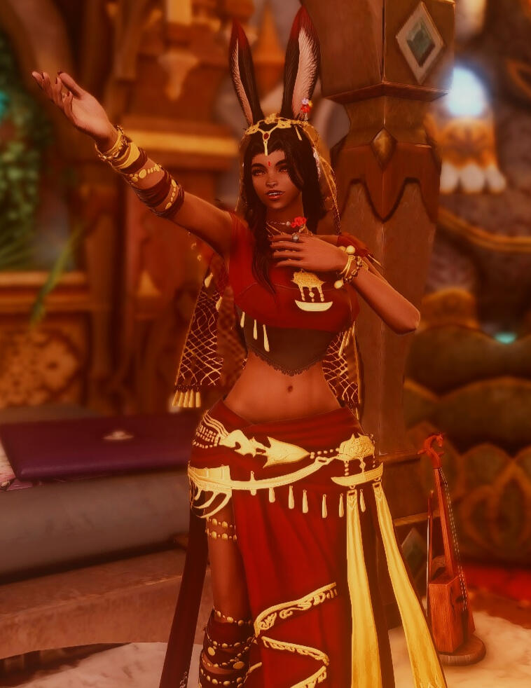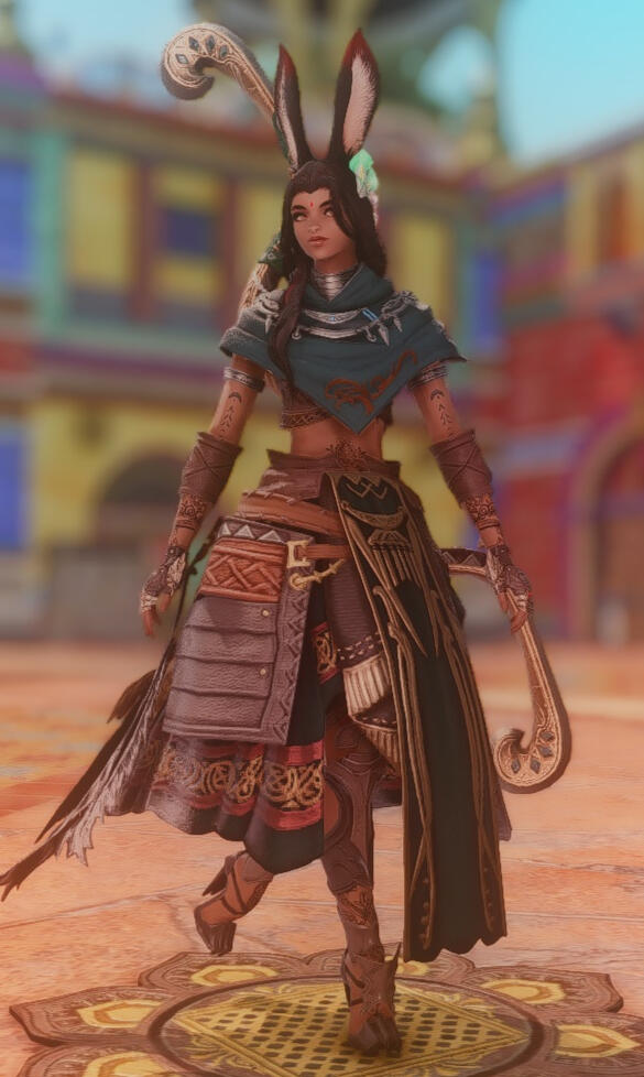 Sarahi was born and raised in a village deep in Vanaspati Jungle in Thavnair. She is the fourth born of six in the Vaali family. While they worshiped the Manusya and Mrga, they encouraged religious, self, and world exploration, as well as diligence in their duties and responsibilities to the village. Growing up in a multiracial village that fostered a creative and nurturing environment, she was encouraged to find her own path in life and chose to remain with her village as one of its guardians.Since childhood, Sarahi had a love for animals, and cultivated a talent for mimicking animal sounds, especially bird calls. This, along with her talent for singing and playing instruments made her a very vivid storyteller in which she would tell immersive tales of the Mrga and Manusya.When she came of age, she chose to remain with her village as one of its defenders alongside her sisters, and would have likely remained there for the rest of her days, if not for the recent threats to their village brought on by the Final Days. After arduous battles, her reclusive village, along with the rest of the nation, has been recovering, rebuilding and even welcoming helpful travelers. These events also sparked curiosity in her to explore the world beyond the borders of Thavnair like some of her siblings have, and has decided to seek out songs and stories from other people around the star.Recently, she's been spotted at Radz-at-Han running errands, telling stories and singing in small gatherings throughout the city for fun, and has been enjoying meeting new people.
